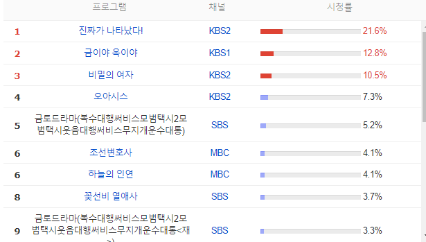 현재 지상파에 방영 중인 드라마를 중심으로 시청률이 가장 높은 순위를 알아보겠습니다. 21.6%라는 높은 시청률을 기록한 1위 드라마는 KBS2에서 방영 중인 <진짜가 나타났다!>입니다. 진짜가 나타났다는 주말드라마로 1회부터 시청률이 두 자리 숫자로 높았습니다. 2위는 시청률 12.8%인 KBS1 드라마 <금이야 옥이야>입니다. 일일드라마로 3월 27일부터 방영되었고 1회 방송 시청률은 14.4%였으나 조금씩 떨어지는 경향이 보이고 있습니다. 3위는 KBS2에서 방영 중인 <비밀의 여자>입니다. 10.5%의 시청률을 기록하고 있으며 일일드라마로 평일 저녁 방영되고 있습니다. 4위는 KBS2에서 방영 중인 <오아시스>입니다. 시청률 7.3%를 기록했으며 월화드라마로 총 16부작 방송이었습니다. 4월 25일을 마지막으로 현재 방송은 끝이 났습니다. 5위는 SBS에서 방영되었다 이미 종영된 <모범택시 2>입니다. 현재 재방송이 진행되고 있어 시청률은 5.2%입니다. 하지만 16부작인 모범택시 2의 마지막 방송은 무료 21.8%의 시청률을 기록했습니다. 그 외에 MBC 드라마 <조선변호사>와 <하늘의 인연>, sbs 드라마 <꽃선비 열애사>는 각각 4.1%, 4.1%,3.7%의 시청률을 기록하고 있습니다.